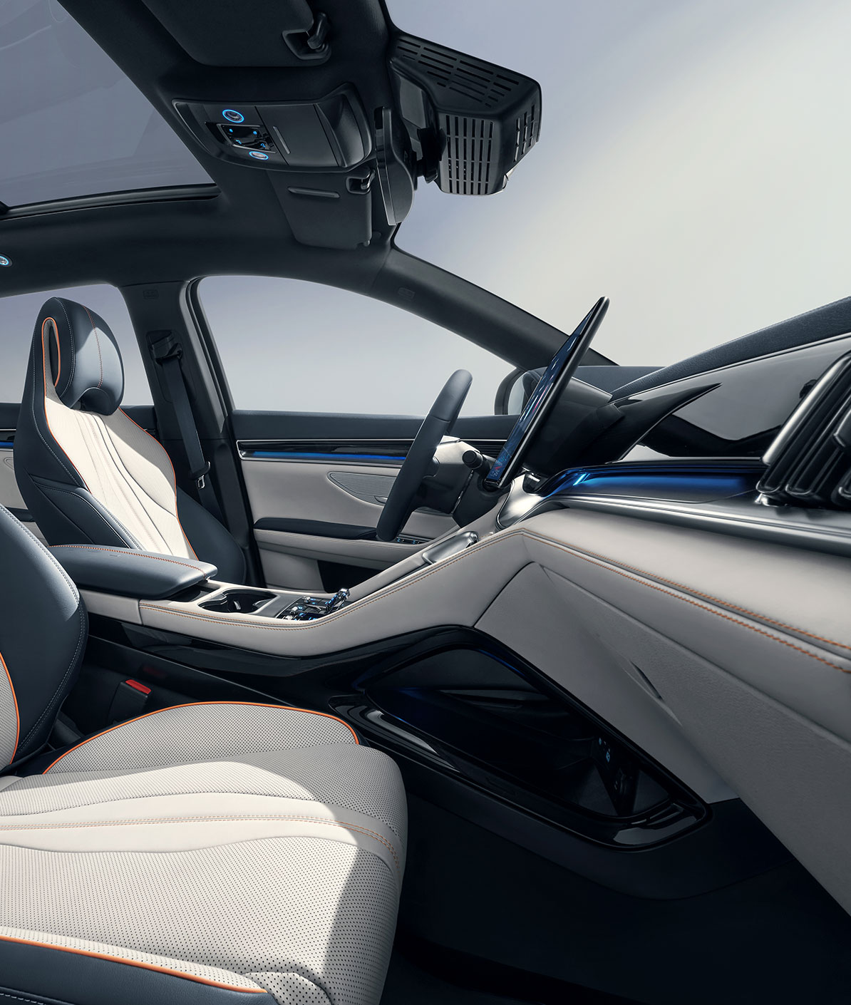 داخل کابین، طراحی بسیار تمیز و مدرن دیده میشود. صفحه نمایش بزرگ با قابلیت چرخش عمودی/افقی، تریم باکیفیت، نورپردازی داخلی و پنل دیجیتال پشت فرمان باعث شده تجربهای فراتر از یک کراساوور میانرده ارائه شود. امکاناتی مانند: